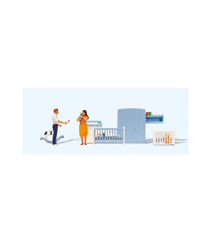 Setul„În camera copilului”este perfect pentru a recrea atmosfera unei camere de copii la scara H0 (1:87). Acesta include figurine și accesorii detaliate care captează momente din viața unui copil, fiind ideale pentru diorame ce reflectă viața de zi cu zi dintr-un apartament sau o casă.