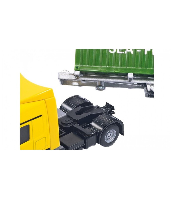 Mercedes Actros Container Siku scara 1:50, cod 3921. Camion transcontainer Mercedes Arocs la scara 1:50 cu cabina si sasiu metalice, remorca metalica avand doua containere din plastic. Rotile sunt din cauciuc. Doua containere sunt incluse, acestea se pot transporta simultan sau numai cate unul. Containerul se poate pozitiona si individual pe remorca in trei pozitii: avansat, la mijloc sau in spate. Se poate folosi si containerul de la camionul cu codul 3922. Mai mult decat atat usile containerelor se deschid iar acestea pot fi incarcate. Remorca se poate fixa in stationare ca in realitate, separat de camion cu ajutorul pilonilor mobili. Remorca se ataseaza / detaseaza la camion cu ajutorul unui levier - inovatie traditionala Siku. Este ambalat intr-o cutie eleganta avand dimensiunile: 36 x 11 x 7 cm. Lungime camion + remorca: 32 cm. Anvelopele cauciucate garantează o tracțiune solidă astfel incat manevrabilitatea ofera multa placere! Recomandat copiilor peste 3 ani. Dimensiuni produs: Lungime: 31 cm / inaltime: 7 cm / latime: 6 cm. Este ambalat intr-o cutie eleganta avand dimensiunile: Lungime: 36 cm / inaltime: 12 cm / latime: 7 cm