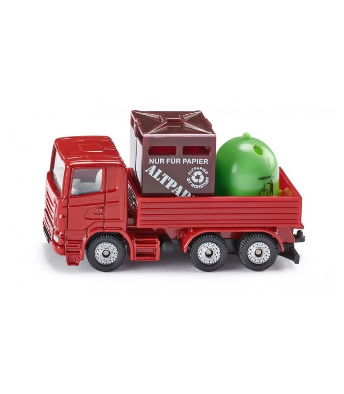 Camion stilizat Scania, cu bena si doua containere, realizat din metal (cabina si sasiu) cu bena si containerele realizate din plastic, in seria de buget 08, ambalat blister. Dimensiuni 8 x 2,8 x 4,4 cm. Recomandat copiilor peste 3 ani