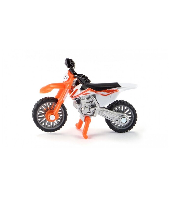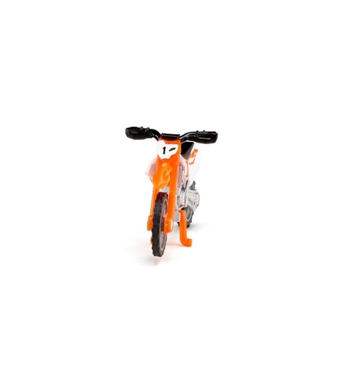 KTM SX-F 450 de la Siku, o reproducere detaliata a originalului, această motocicletă este prezentată în detalii complete și cu o calitate premium a turnării în zinc. SX-F apare într-o culoare tipica, are ghidon mobil și un cric care poate fi pliat, ca in realitate. O plansa cu numere autoadezive pentru decorarea motocicletei este inclusa. Este unul dintre elementele marcante ale seriei Blister13 de la SIKU! O reproducere realistă, acest model de motocicletă dinamică, cu motor de injecție de admisie autentică, vine ca un model SIKU diecast high-end. Dimensiuni: 5,6 / 2,8 / 3,4 cm. Nu este recomandat pentru copii mai mici de 3 ani.