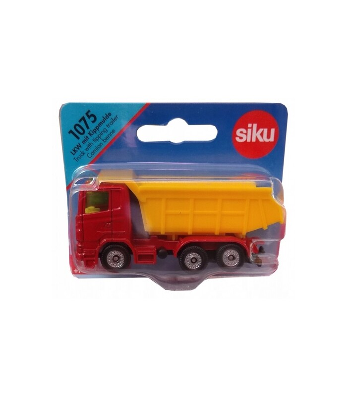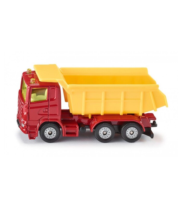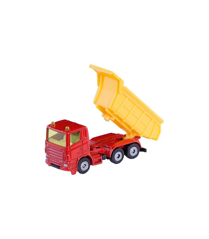 Camion stilizat Scania, basculanta, realizat din metal (cabina si sasiu) cu bena realizata din plastic, in seria de buget 10, ambalat blister. Este basculabila manual. Dimensiuni 8,3 x 3 x 3,8 cm. Recomandat copiilor peste 3 ani
