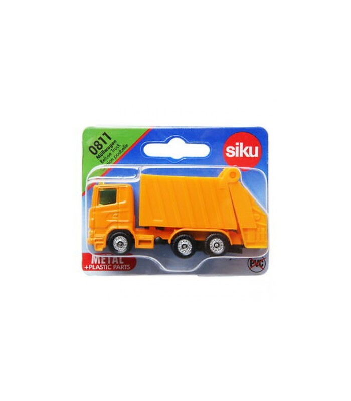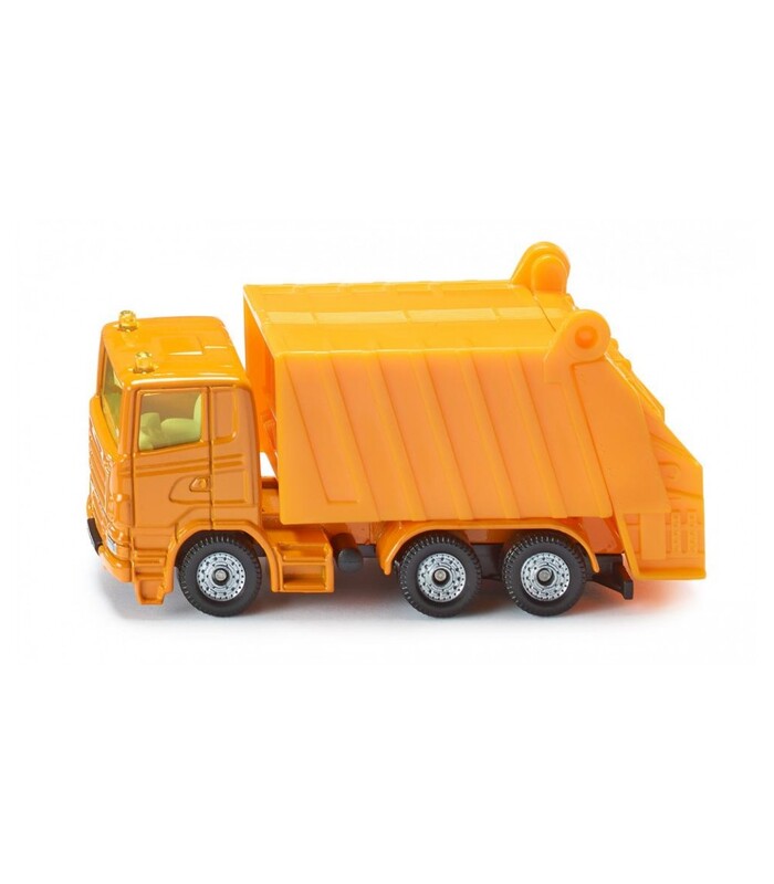 Camion stilizat Scania, de gunoi, realizat din metal (cabina si sasiu) cu gunoiera realizata din plastic, in seria de buget 08, ambalat blister, este basculabila. Dimensiuni 8,7 x 2,8 x 4,4 cm. Recomandat copiilor peste 3 ani