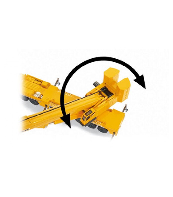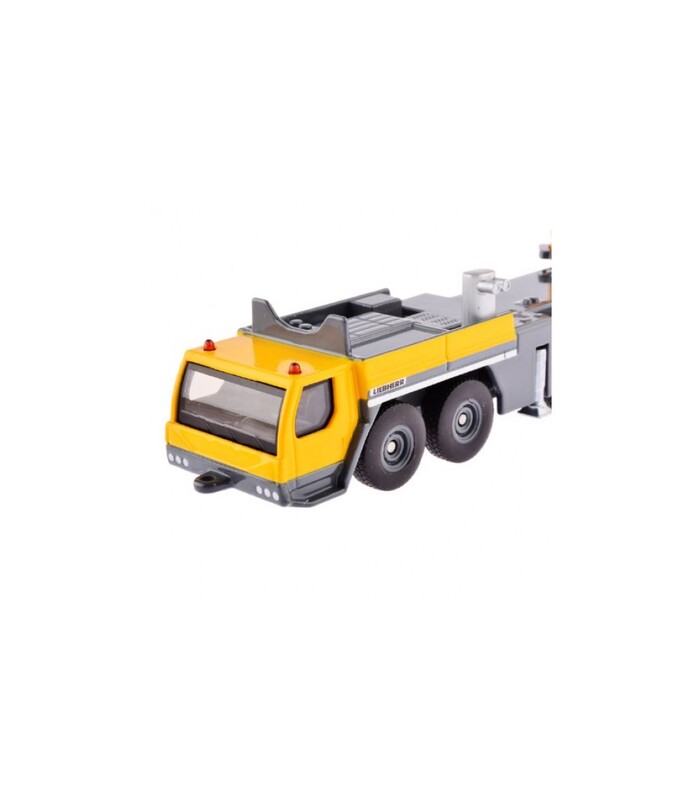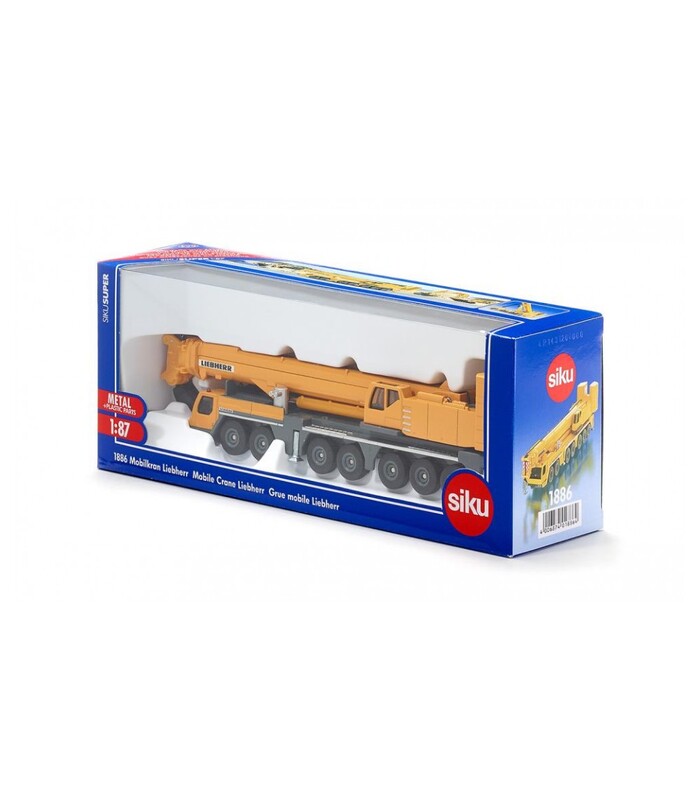Liebherr la scara 1:87 cu 7 axe: este in acelasi timp jucarie solida si macheta de colectie cu cabina si sasiu metalice, platforma metalica si macara metalica de calitate. Macaraua are licenta originala Liebherr, se poate ridica sau roti manual si este dotata cu accesoriile caracteristice, ca in realitate, inclusiv un carlig greu metalic care face manevrarea deosebit de placuta. Este dotata cu 7 axe si cu 4 piloni de sustinere metalici care echilibreaza macaraua. Este ambalata intr-o cutie eleganta avand dimensiunile: 10 x 4,8 x 3 cm. Anvelopele cauciucate si constructia solida garanteaza o tractiune ferma astfel incat manevrabilitatea ofera multa placere! Recomandat copiilor peste 3 ani! Dimensiuni produs: 21 cm x 8 cm x 35 cm