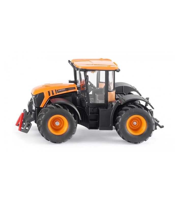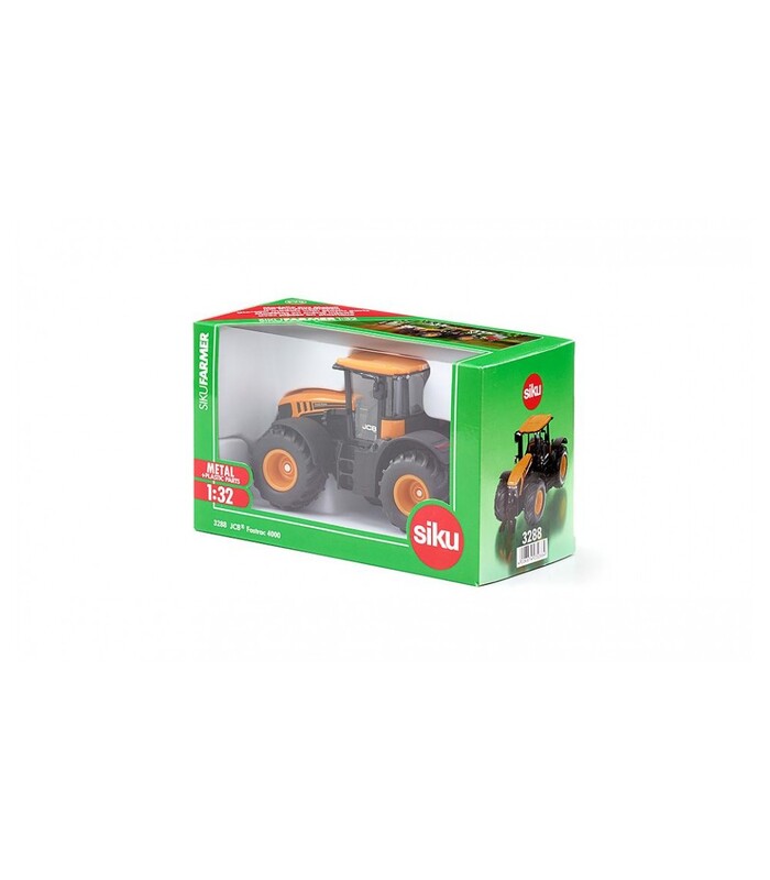 TractorJCB Fastrac 4000 Siku, replica fidela a tractorului original la scara 1:32. Este realizat complet din metal cu exceptia cabinei detasabile, din plastic. Este dotat cu sisteme metalice de cuplare a accesoriilor fata-spate (accesoriile sunt prezentate ca exemplu si nu sunt incluse, se pot comanda separat). Rotile sunt realizate din cauciuc si respecta designul original. Oglinzile sunt rabatabile, rotile fata cotesc iar capota fata se ridica. Suspensia fata penduleaza exact ca in realitate. Este ambalat intr-o cutie pe care sunt specificate performantele tractorului real. Se recomandă copiilor peste 3 ani. Dimensiunile produsului: Lungime / înălțime / lățime: 19 / 9,7 / 9 cm