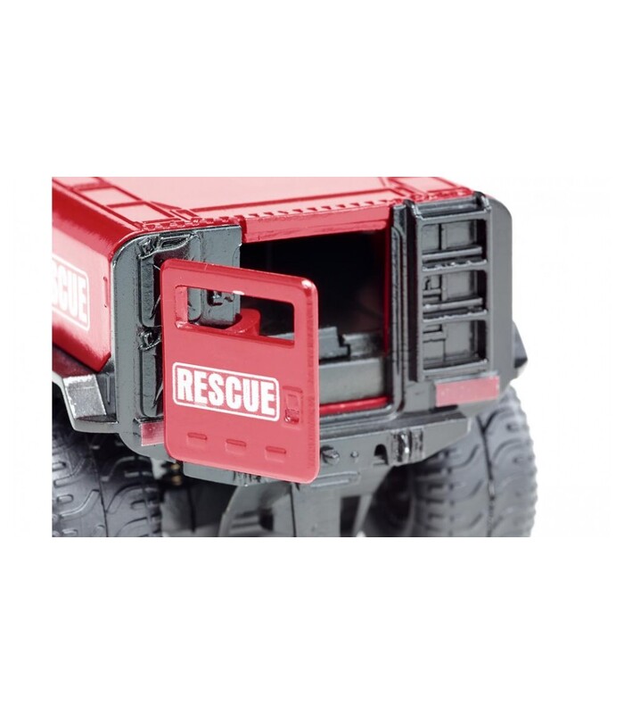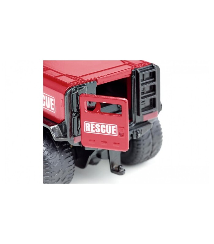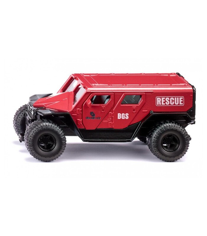 Vehicul de salvare GHE-O Rescue realizat de Siku la scara 1:50. Acest vehicul de salvare cu un design impresionant nu are nevoie de o sirena sau lumini intermitente pentru a se face remarcat. GHE-O Rescue este produs de compania romaneasca Ghe-o Motors avand propria sa clasa in lumea masinilor off-road: poate face fata celor mai grele situatii chiar si cu 11 oameni la bord, dimensiuni de 5,2 / 2,7 / 2,39 m, o greutate de 3,2 tone, motoare care pot furniza 500 CP, accesorii diverse de salvare sau acces in cele mai extreme situatii de urgenta. Siku lanseaza versiunea la scara 1:50 realizata cu fidelitate din metal, dupa modelul vehiculului real GHE-O Rescue. Cu punțile față și spate avand arcuri și pneurile mari cu balon, miniatura este, de asemenea, perfect echipată pentru terenuri imposibile. Anvelopele realizate din cauciuc avand profilul masinii reale au o aderenta sporita si pot fi scoase pentru simularea unui schimb de roti. Cele doua uși din față și ușa din spate pot fi deschise, astfel încât accesul în vehicul inclusiv cu o targa se realizeaza usor. Pe cutia masinutei sunt inscriptionate performantele vehiculului real. La spate este dotata cu un carlig de remorcare iar in fata cu un element de prindere care va fi folosit pentru alte accesorii disponibile in viitor. Misiunea de salvare va fi intotdeauna reușită! Dimensiuni produs: Lungime: 11,3 cm / inaltime: 5,6 cm / latime: 4,7 cm. Este ambalat intr-o cutie eleganta avand dimensiunile: Lungime: 15,5 cm / inaltime: 7,5 cm / latime: 6,5 cm