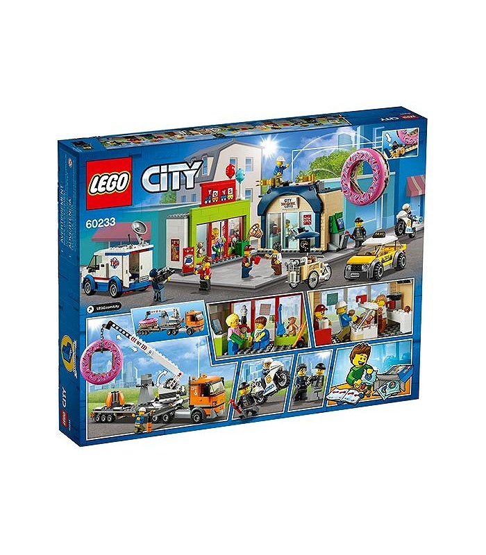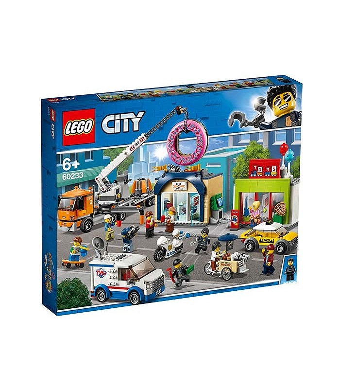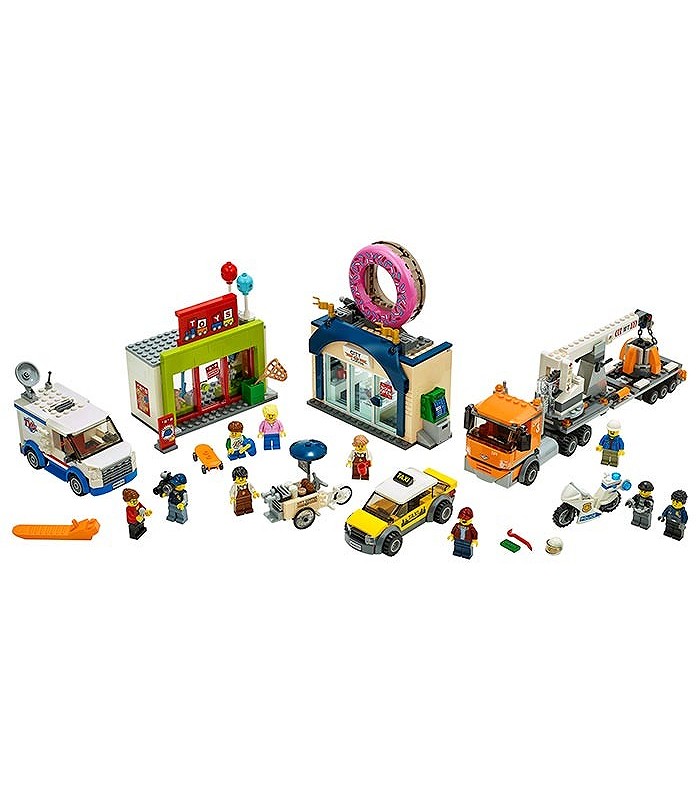 Uite macaraua cum ridică gogoașa gigantică în poziție. Miam, gogoșile sunt cele mai bune! Uită-te la toate jucăriile din magazinul de jucării. Ooo, au de vânzare noua șapcă cu elice. Atenție! Reporterul spune că lanțul tocmai s-a rupt pe gogoașă, care o ia la vale! Stai, pungașul acela încearcă să spargă bancomatul? Ofițerul Duke DeTain de la Poliția LEGO® a preluat cazul! Poți prinde gogoașa înainte de a se rostogoli? Construiește ceva palpitant cu seturile de joc LEGO® City!