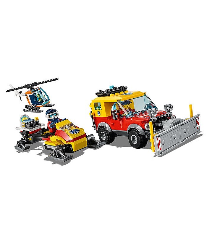 Acest excelent set de construcție pentru copii mai include și un camion de salvare 4x4 cu plug de zăpadă mobil, snowmobil cu remorcă atașată, plus un elicopter cu carlingă cu deschidere, rotoare care se învârt și o cameră, 11 minifigurine, o figurină câine și figurină om de zăpadă construibilă.